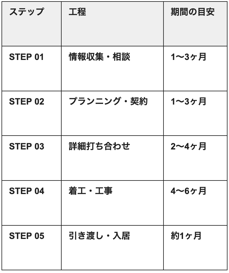 建売住宅やマンションとは異なり、土地探しやプランニング、建築工事といった多くの工程を一つひとつ積み上げていくため、どうしても1年以上の長い期間が必要です。